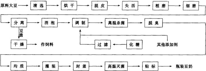 | 释义 | 豆奶加工装备 1 概述 将以大豆或低变性大豆蛋白粉为原料,加入一定辅料,按照一定的工艺要求加工成豆奶的设备称豆奶加工装备。豆奶加工分湿法和半湿法两种加工工艺。由于半湿法省去了原料大豆的浸泡工艺,因而具有生产周期短、易于实现生产过程的连续化和自动化,是今后的发展方向。 2 加工工艺 湿法工艺采用的是需预先进行浸泡的传统制浆方法,此法与豆腐等制品的制浆工艺基本相同。因此本节主要介绍半湿法豆奶加工工艺(图1-14-17)。
