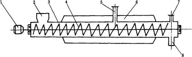 图1-14-18 脂肪氧化酶失活机示意图 1-无级调速装置 2-料斗 3-机体 4-螺旋搅拌推进器 5-蒸汽进管 6-保温层 7-热水进管 8-出料口 3.2 胶体磨 参见第1篇第17章第3节。 3.3 混合机(图1-14-19)