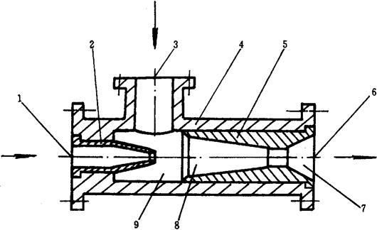 图1-14-20 真空消泡罐结构示意图 1-出料口 2-进料口 3-罐体 4-压力表 5-真空装置接口 真空消泡罐是利用抽真空,使泡沫内外的空气出现压差而爆破,达到消泡的目的。消泡罐的主体为一呈圆柱形的罐体3。从进料口2吸入的豆浆经消泡后从底部的出料口1排出,真空装置接口5与抽真空装置连接。工作时罐内的真空度控制在0.039~0.053MPa即可。真空度可从压力表4读出。 3.5 杀菌、脱臭装置 杀菌、脱臭装置用于将调制好的豆奶,连续完成预热、高温杀菌及真空脱臭三道工序。该机主要由3台功能各自独立的单机,即蒸汽喷射式加热器、高温杀菌罐及真空脱臭罐组装在同一机架上而成。与其配套工作的附属设备有水力喷射器及多级泵等。 3.5.1 蒸汽喷射式加热器(图1-14-21) 蒸汽喷射式加热器用于将已调好的豆奶进行预加热。该加热器工作时,蒸汽在通过喷嘴2以很高的速度进入吸入室,喷嘴2的出口处形成压力较低的区域,豆奶被吸入后与高速汽流在混合室8均匀混合,豆奶也从高速汽流中获得部分能量。混合流迅速进入喷管的扩散室7,并逐渐减速、升压与升温。当混合流到达扩散室7出口处时,豆奶的压力及温度达到进入下一级高温杀菌罐的操作要求时,从豆奶出口6排出。由于豆奶与高速汽流在混合室的混合过程极快,来不及进行热交换即进入扩散室,因而其热交换过程主要是在扩散室完成。该加热器具有加热速度快(仅需1s左右)、噪音小,以及工作平稳、振动小等优点。