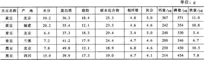 (1)大豆脂肪 大豆脂肪在常温下为黄色液体,为半干性油。大豆脂肪在人体内的消化率高达97.5%,不含胆固醇,因此它是优质食用植物油。大豆脂肪可在分解酶的作用下水解成脂肪酸和甘油。大豆脂肪的特点是以不含饱和脂肪酸为主,如油酸、亚油酸、亚麻酸等,约占总脂肪酸量的60%,因此易于氧化,也易于阻止胆固醇在血管中沉积。大豆脂肪酸的一般组成为:棕榈酸2.4%~6.8%,硬脂酸4.4%~7.3%,花生脂酸0.4%~1.0%,油酸32%~35%,亚油酸51.7%~57%,亚麻酸2%~10%等。 除此之外,大豆脂肪中还含有不皂化物质,包括甾醇类(豆甾醇、谷甾醇等)和维生素E等。生育酚类含量约为0.2%,其中α型约占10%,γ型约占60%,δ型约占30%。生育酚类物质使油脂具有抗氧化性。 (2)碳水化合物 大豆中碳水化合物含量约为25%。其组成比较复杂,主要由蔗糖、棉子糖、水苏糖以及如阿拉伯糖和半乳糖类的多糖构成。这些碳水化合物,除蔗糖外都难以被人体所消化,但有些糖类物质在人体肠道内能被菌类利用,而在肠内产生气体。在加工豆制品时,这些碳水化合物易转入浆水中而被除掉。 (3)无机物 大豆中的无机元素多为钾、钠、钙、镁、硫、氯、铁、铜、锰、锌、铝等,它们的总含量一般为4.5%~5.0%。 (4)磷酸脂类 大豆中的大部分磷酸脂类是植酸钙镁。大豆有机磷中磷脂(卵磷脂和脑磷脂)含量相当多,它是脂肪酸的甘油酯和磷及胺类物的结合体,其含量为大豆油的1.8%~3.2%。磷脂质除了对人体有良好的营养作用外,性质上还具有很好的乳化作用。 (5)维生素 大豆中含有多种维生素,含量(单位:mg/100g)分别为:胡萝卜素0.12~0.41,维生素B10.38~0.7,维生素B20.15~0.24,维生素PP(烟酸)0.2~2.1,维生素B60.6~1.2,泛酸1.2~2.1,维生素C21,肌醇229。 4.豆制食品采用大豆的质量标准 我国豆制食品采用大豆的质量标准参见GB/T 8612-1986《豆制食品业用大豆》见表1-1-33。 表1-1-33 豆制食品业用大豆质量指标
