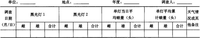 | 释义 | 豆野螟测报调查方法 豆野螟(Maruca testulalis Geyer)属鳞翅目,夜蛾科。全国各地都有发生。以南方、华南、西南、长江流域等地发生较重。该虫主要寄主有豇豆、菜豆、扁豆等豆科蔬菜。豆野螟是豆类蔬菜主要害虫种类之一,喜高温、闷湿的环境。适宜豆野螟生长发育的温度范围15~36℃,最适环境温度为25~29℃,相对湿度85%~100%。产卵有很强的选择性。卵多产在始花至盛花期的类型田内。卵散产或多粒产。平均每头雌蛾可产卵80~100粒,90%以上的卵粒产在含苞欲放的花蕾或花瓣上。初孵幼虫即蛀入花蕾或花器,取食幼嫩子房花药,被害花蕾或幼荚不久同幼虫一起掉落,幼虫再次重返植株转移为害蛀食花或幼荚。三龄以上的幼虫除少部分继续为害花外,大部分以蛀食豆荚为生,少数也可吐丝卷叶为害。 1 调查内容与方法 1.1 蛾量消长系统调查 1.1.1 调查时间 从当地常年平均发生期前20天至常年平均终见期15天止。 1.1.2 调查方法 1.1.2.1 灯诱成虫 诱蛾灯设在豇豆或菜豆田边。每日晚上6:00至第二天早上5:00(用有微电脑控制功能的灯具,也可使用佳多杀虫灯或佳多智能型测报灯,诱蛾量与峰型比普通测报灯效果明显)通宵点20W黑光灯2盏(诱蛾灯的灯管最长使用期为30天),两灯至少相距200m,逐日早上调查集虫箱内诱捕的成虫数(集虫箱内使用广口瓶,内加敌敌畏200ml,用2层纱布封口,每10天添加20ml补液),区分雌雄蛾后,将结果填入表6-103。 表6-103 豆野螟灯诱成虫消长调查记载表