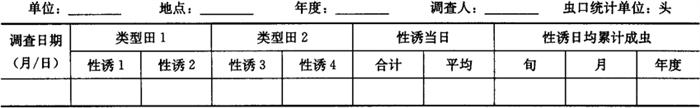 1.1.2.2 性诱成虫 选豇豆生育期处在始花、盛花期田块的上风处,用豆野螟专用性诱剂,设水盆式诱蛾器2只(水盆式性诱器规格要求:直径18~20cm的圆盆或方盆,盆高8~10cm,距盆上口下1cm位置直线钻穿诱芯的细铁丝孔2个,盆内放清水至6~8cm高度,以水面与穿用的诱芯距1~1.5cm为适),相邻两个诱蛾器至少间隔100m,每次(盆)穿用诱芯1个(备用的诱芯应放在冰箱内5~7℃的条件下冷藏保存),诱芯每月换1次,以确保性诱效果。逐日早上调查诱捕成虫数。将结果填入表6-104。 表6-104 豆野螟性诱成虫消长调查表
