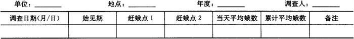 1.2 田间虫情系统调查 1.2.1 调查时间 从当地田间豆野螟幼虫常年平均发生期前10天至常年平均终见期止。 1.2.2 调查方法 根据当地生产季节,分别选有代表性的春、夏、秋播茬口的豇豆、菜豆、扁豆等作物各2块,自作物进入始花期开始到盛花末期(需要适时换调查田块)。每2天1次,采用5点取样,在田间收集(豇豆)落地鲜残花200朵或已盛开过鲜花(菜豆、刀豆),调查鲜花虫害花率和百花幼虫量。同时抽查200根豆荚,调查幼虫蛀荚数。将田间虫情系统调查结果汇总记入表6-106。 表6-106 田间虫情系调查记载表