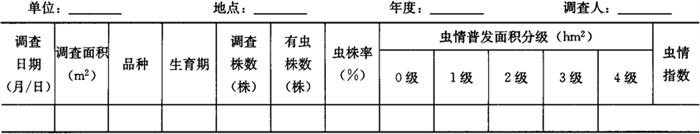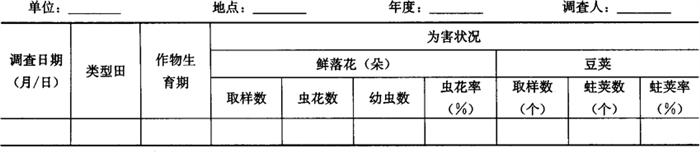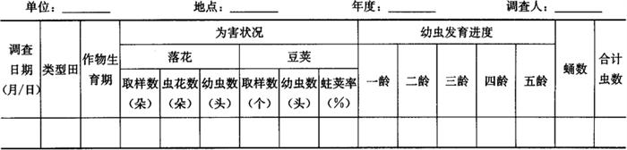 1.4 大田虫情巡回普查 1.4.1 调查时间 各代豆野螟蛾发生为害盛期。 1.4.2 调查方法 根据当地生产季节和种植的主栽茬口,分别选豇豆、菜豆、扁豆作物各3~5块,每10天1次,采用对角线5点取样法,在田间收集(豇豆)落地鲜残花或已盛开过鲜花(菜豆、刀豆)200朵。调查鲜花虫害花率和百花幼虫量,调查总田块数不少于10块。将大田虫情巡回普查结果填入表6-110。 表6-110 豆野螟大田虫情普查结果汇总记载表