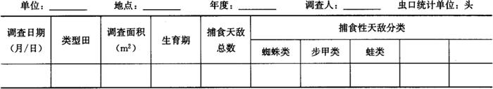 1.3 害虫天敌调查 1.3.1 调查时间 每年在各代盛发高峰期后一周内按代次调查。 1.3.2 捕食性天敌调查方法 根据当地生产季节,按种植茬口分别选有代表性的豇豆、菜豆、扁豆类型田各2块,采用对角线5点取样法,每点1m2。调查田间的捕食性、天敌种类和数量。将捕食性天敌调查结果汇总填入表6-108。 表6-108 豆野螟田间捕食性天敌调查表