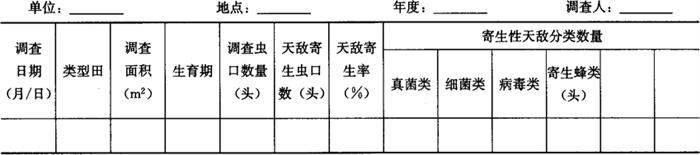 1.3.3 寄生性天敌调查方法 于各代次发生高峰期,在田间采集中、高龄幼虫样本,每次采集虫口不少于200头,带回室内分隔在试管内饲养至化蛹。观察寄生性天敌种类及其对幼虫的寄生率。将寄生性天敌调查结果汇总填入表6-109。 表6-109 豆野螟田间寄生性天敌调查表