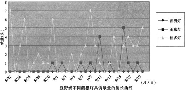 豆野不同测灯具诱蛾量的消长曲线 |
