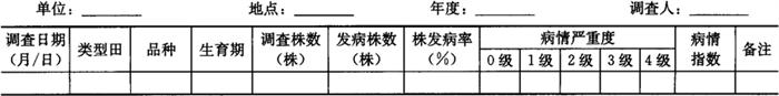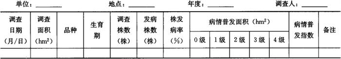 1.2 大田病情巡回普查 1.2.1 调查时间 在各地豇豆锈病进入发病始盛期开始至豇豆采收结束前10天结束。 1.2.2 调查方法 选进入成株期豇豆的早、中、晚茬口各主栽品种的类型田各2~3块,调查总田块15块以上。采用对角线5点取样法,每10天1次,每点定株20株,共取样100株。调查株发病率。将巡回普查结果汇总填入表6-38。 表6-38 豇豆锈病大田病情普查结果汇总记载表