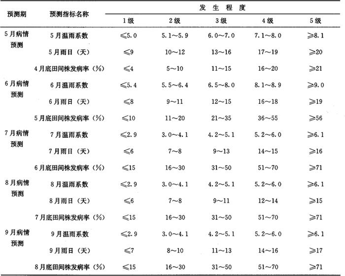 2 预测预报方法 2.1 病情趋势预报 主要根据田间系统调查的发病率、病情指数、中长期天气预报的温雨系数、作物的感病生育期等推测预报发生趋势。 2.2 短期防治预报 根据当前的发病率、病情指数、近期天气是否适宜发病的闷热温天气等情况,发布防治预报。 3 测报参考资料 3.1 病情指数分级标准 ◆0级:全株无病; ◆1级:全株1/4以下的叶片有少数病斑; ◆2级:全株1/2以下的叶片有少量病斑或1/4以下的叶片有较多的病斑数; ◆3级:全株3/4以下的叶片发病或部分叶片变黄枯死; ◆4级:全株3/4以上的叶片发病或1/4以上叶片变黄枯死。 3.2 大田病情巡回调查分级标准 ◆0级:无病; ◆1级:株发病率≤25%; ◆2级:株发病率25.1%~50%; ◆3级:株发病率50.1%~75%; ◆4级:株发病率≥75.1%。 3.3 防治适期 防治适期为发病始见后8~12天或田间株发病率8%~10%,进入生长盛期至采收中后期前的各型大田。 3.4 豇豆锈病的适宜发病条件 最适发病环境条件:23~27℃,相对湿度90%~100%。连续闷热天气,温雨系数7.5以上。 发病潜育期:8~10天。 最适感病生育期:开花结荚至采收期。 3.5 豇豆锈病发生程度测报预警参考