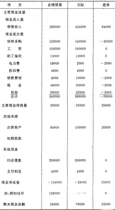 业绩预算则是以实际销售数量为基础,按照计划价格,预算的变动费率和固定成本进行计算的。 实际的数字则根据会计记录填列。 活动差异主要是指由于销售数量的增减而引起销售收入和变动成本的变化,根据业绩预算的利润计划比较来确定。业绩预算的销售收入较利润计划增多,是增加盈利的有利因素,常以正数表示,反之以负数表示。变动成本的表示方法则相反,业绩预算的变动成本大于利润计划中的数额为不利因素,以负数表示,反之则以正数表示。 价格差异是指销售价格变动而引起,比如实际销售收入与业绩预算的差异12000元,其销售数量都是以实际为基础,所以只能是价格变动引起的。 图表3-10 现金流量报告 19××年 单位:元