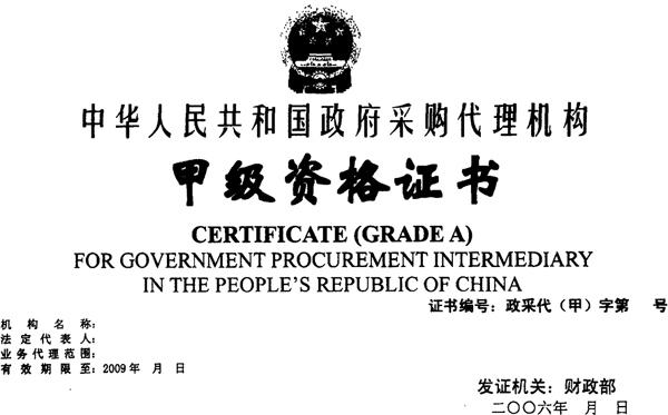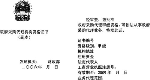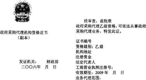 须知 一、《政府采购代理机构确认资格证书》是社会中介机构从事原招标代理业务范围以内的政府采购项目招标代理资格的凭证。 二、《政府采购代理机构确认资格证书》原则上有效期为三年。在有效期内,原招标代理资格证书失效的,本证书自动失效。 三、社会中介机构应在核准的业务范围内代理政府采购事宜。 四、证书记载事项依法发生变更的,应当自变更之日起十日内办理变更或者换证手续。 五、解散、破产或者因其他原因终止政府采购代理业务的,应当自情况发生之日起十日内向主管发证机关交回证书正、副本,办理注销手续。 六、分立或者合并的,应当自情况发生之日起十日内向主管发证机关交回证书正、副本,办理注销手续;分立或者合并后的机构需要代理政府采购事宜的,应当重新申请政府采购代理机构资格。 七、政府采购代理机构在有效期满60日前,向主管发证机关提出资格延续申请。 八、资格等级证书正、副本,不得涂改、转让、租借。 附件2:申请甲级政府采购代理机构资格具体程序说明 一、准备申请材料 申请甲级政府采购代理机构资格的机构,应按照《政府采购代理机构资格认定办法》及本通知规定和要求,准备相关申请材料,其中,京外申请甲级资格的机构,要提供所在地省级财政部门对固定营业场所的审核意见。同时,按要求填报《政府采购代理机构资格审批申请书》或《政府采购代理机构资格确认申请书》(附后)。 二、基本程序 甲级政府采购代理机构资格申请采用网上申请的方式。申请时,需要申请甲级政府采购业务代理资格的社会中介机构,要登录中国政府采购网(www.ccgp.gov.cn)“资格申请”专栏,按照网上提示完成申请程序。同时,请将相同的书面申请材料加盖公章报送财政部。申请时间以收到书面材料时间为准。 具体程序如下: