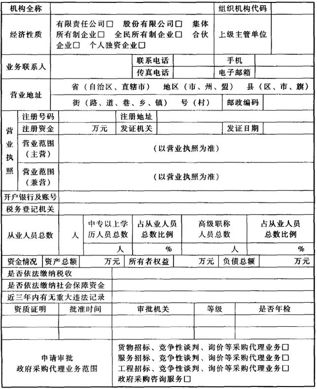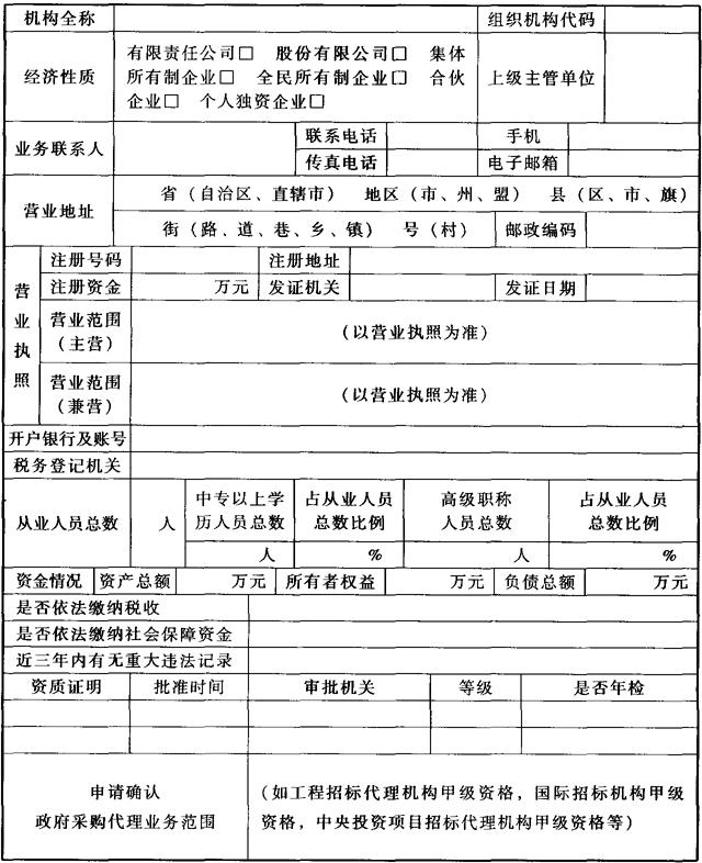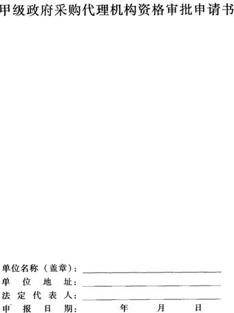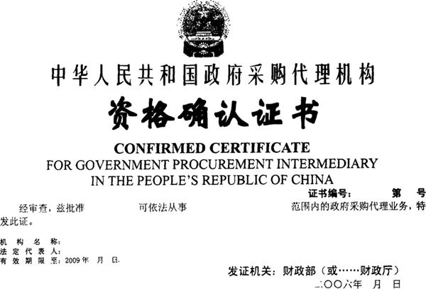三、申请材料规格要求 申请书和申请材料统一使用A4纸,原则上文本字体使用仿宋四号,装订成册,并加盖公章。申请表格和申报材料一式两份,可以直接报送也可以采取邮寄方式。 四、申请时间 根据《政府采购代理机构资格认定办法》规定,符合本通知要求,有意承担政府采购业务代理的中介机构,在2006年3月1日~3月31日提出申请的,请于2006年3月31日前按要求将申请材料上报,财政部统一按3月31日为认定受理时间。3月31日以后,采取随时提出申请、随时认定的方式。 五、公布认定结果 财政部对拟作出的资格认定决定,在财政部政府采购信息指定媒体上公示7天。公示无异议的,财政部将颁发资格等级证书,同时在政府采购信息指定媒体上正式公告。 联系地址: 财政部国库司政府采购管理处(北京市西城区三里河南三巷三号,100820),联系电话:010-68552272、2269 传真:010-68552231。 中国政府采购网(www.ccgp.gov.cn),联系电话及传真:010-63819289 附:1.甲级政府采购代理机构资格审批申请书 2.政府采购代理机构资格确认申请书 附1: