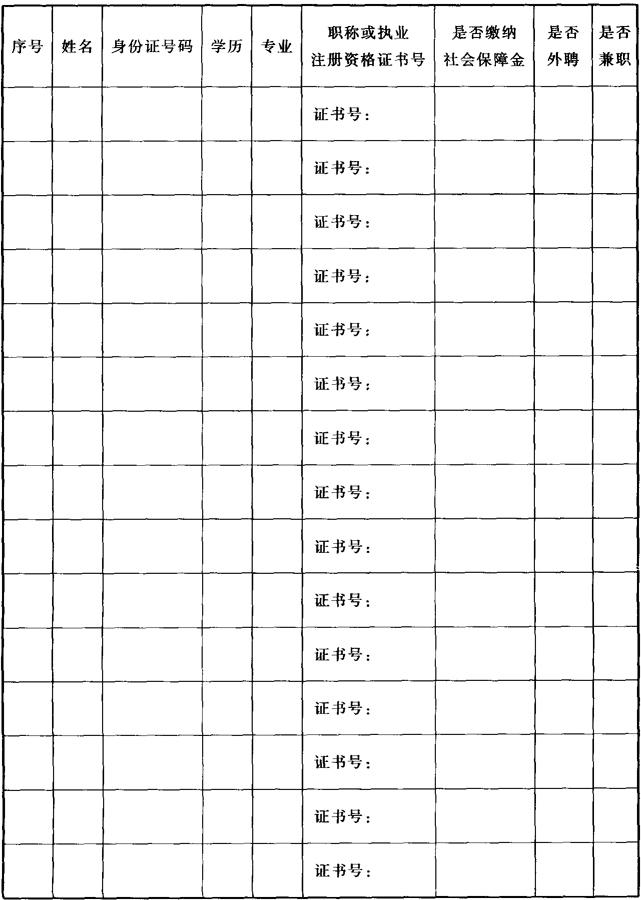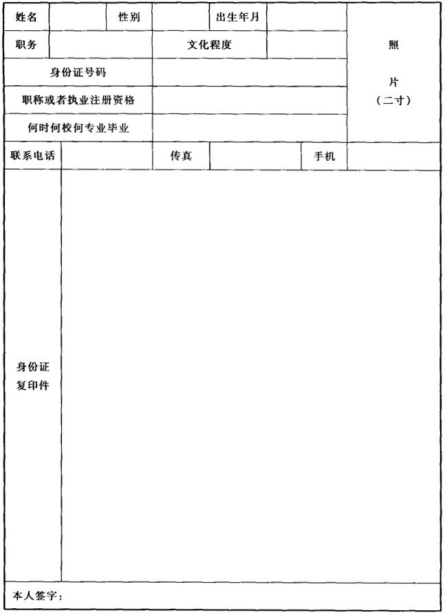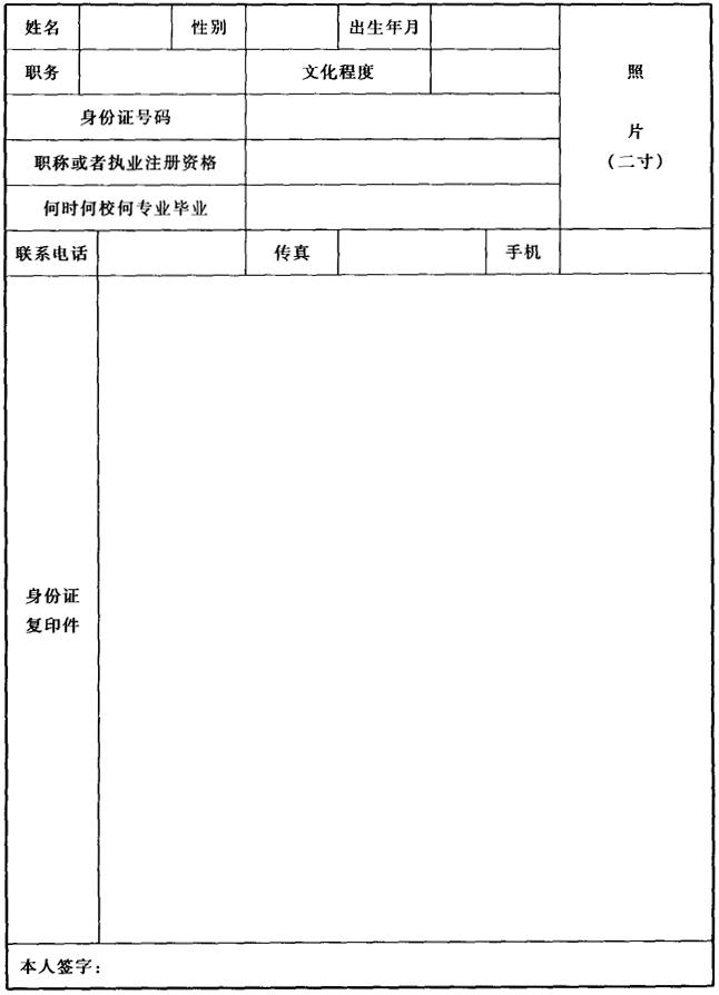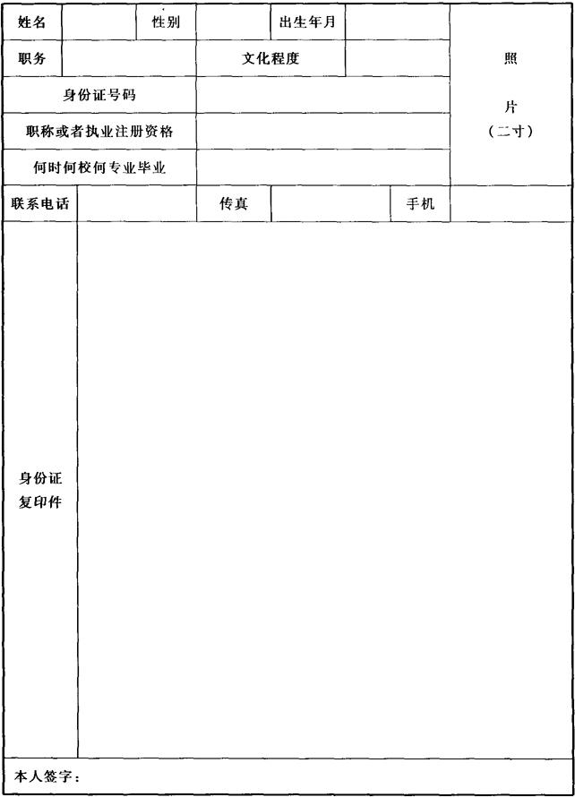 说明:1.表中主要财务指标根据会计师事务所出具的验资报告或者上年度的财务审计报告填列。 2.人员总数应为专职人员人数。 3.其他情况是指申请单位认为有必要说明的有关情况。 表二 主要负责人员简况(法定代表人)