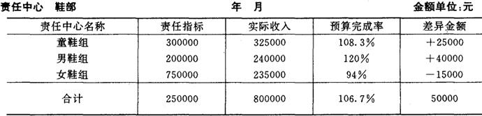 销售收入责任指标__元;今日累计销售额__元;销售收入预算完成率__;经营品种额__种;实有品种__种;商品齐备率__。注:商品收入责任指标从月度为单位。 在上述“商品进销存报告单”中,“上月结存”项根据上日报告单的“今日销存”数填列;“今日购进”项根据商品验发单加总填列”;“今日调入”项和“今日拨出”项根据“内部商品调拨单的拨入、拨出数分别加计填列;“调价增殖”和“调价减殖”项根据变价商品调整单填列,“盘点溢余”和“盘点短缺”项根据商品溢余(短缺)报告单填列”“今日销售”项根据“内部缴款单”加总填列;“今日结存”项根据报告单“上日结存”加“收入部分”或“支出部分”的余额填列。 (二)利润中心销售收入责任指标的核算 利润中心一般是企业的各个商品部,也可以是商品经营权较大的营业柜组。利润中心对商品销售的核算是通过“营业收入”帐户进行的,收到柜组交来“内部缴款单”和“商品进销存报告单”等赁证即可收入入帐。 [例]鞋帽部(利润中心)下设童鞋、男鞋、女鞋三个柜组,当天的销售收入情况如下:童鞋组内10500元、男鞋组为2500元、女鞋组为7000元。鞋部财会组根据有关销货凭证记: 借:内部银行存款 25000 贷:商品销售收入 25000 在反映上述销售收入的同时,还应从售价注销“库存商品”帐户。即: 借:商品销售成本 25000 贷:库存商品——童鞋组 10500 ——男鞋组 7500 ——女鞋组 7000 在日常核算基础上,利润中心要按月编制该中心“销售收入责任指标计算表”。例如,鞋部下属童鞋、男鞋、女鞋三个责任中心的5月份销售收入责任指标分别为300000元、200000元、250000元,当月销售实际分别为325000元、240000元、235000元。该利润中心“销售收入责任指标计算表”如图表5-10所示。 图表5-10 销售收入责任指标计算表