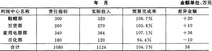 从图表5-13看出,鞋帽利润责任指标的执行情况总的来说是好,利润超预算56140元,利润提高1.03%。从贡献生益可以看出,该部在产品购销过程中成绩较为显着,虽然直接费用率上升0.28%,商品进价成本预算低1%,扩大商品销售200000,从而使贡献生益比预算增长62480元,使贡献生益率比预算增长1.16%。但是企业直接控制的间接费用和支出突破预算6340元,从而使鞋帽部负担间接费用和支出后,利润率比贡献生益率低0.13%。企业今后应将重点放在间接费用和支出控制上。 利润中的除上报“责任利润计算表”外,还应定期上报“资金流量计算表”,从而提供资金使用情况的系统资料。 (四)内部利润上缴的核算 各利润中心的盈利应定期、及时上缴企业。为了反映利润中的年度内内部利润上缴情况,可设“上缴利润”帐户进行核算。该帐户属资产帐户,借方反映各利润中心按月上缴的利润,年终决算后转销财务成果时记入贷方,借方数额反映年度内累计上缴内部利润的数额。 利润中心上缴利润时记: 借:责任中心存款 贷:上缴利润 (五)企业利润责任指标的核算 企业利润责任指标的核算主要是在各利润中心利润责任指标核算的基础上,集中反映企业利润目标的实现程度以及实绩与利润预算指标的偏差,找出产生偏差的具体原因以及找出偏差的责任部门,为实施企业利润目标总体控制,消除不利偏差,保证利润目标实施提供信息。 企业财会部门收到各利润中心报表的“责任利润计算表”之后,应及时编制“责任利润汇总表”。现仍以拥有家电部、鞋帽部、百货部、日化部四个利润中心为例,说明企业“责任利润汇总表”的编制如图表5-14所示。 图表5-14 责任利润汇总表