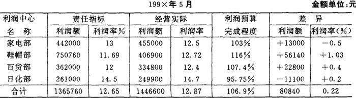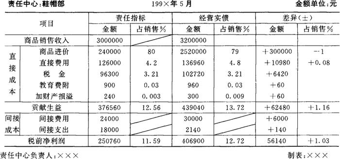 各利润中心每月计算出本中心利润以后,应及时编制“责任利润计算表”,系统反映利润形成过程以及与利润责任指标的差异,为本中心领导和上级管理人员实施利润控制提供依据。现仍以鞋帽部为例,说明“责任利润计算表”的编制如图表5-13所示。 图表5-13 责任利润计算表