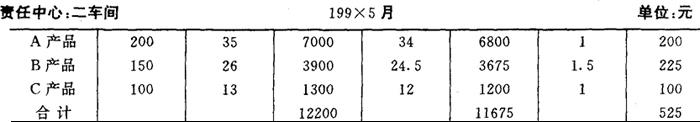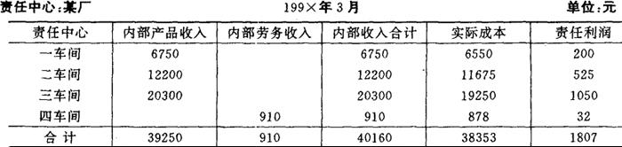 制表人 ××× 从“责任利润汇总表”中可以看出,从总体来看,该企业无论是利润额还是利润率均圆满完成企业利润预算指标。利润额比预算增长80840元,利润率比预算增长0.22%。但从每个利润中心的具体情况来看,同时完成利润额和利润率两项责任指标的只有鞋帽部和百货部。家电部由于采取扩大销售的措施,使利润额增加13000元,但利润率比责任指标低0.5%日化部由于销售预算指标未完成,致使利润额只完成预算95.75%,比预算少11100元,但利润率比预算增长0.2%。 四、责任利润核算实例 下面以工业商业为例,说明责任利润的核算。 设本章第一节的三个基本生产车间和一个辅助生产车间为利润责任中心,内部转移价格是预算的单位成本(即可控成本中的单位责任成本与不可控成本中的单位计划成本之和)。那么,可算出利润责任中心的利润额如图表5-15、5-16、5-17、5-18所示。 根据以上各表资料,可汇总得到全厂责任利润资料如图表5-19。需要指出,在人为利润责任中心中,汇总计算出的收入和利润并不是企业实际上的收入和利润,而只是一种内部虚拟的收入和利润。 图表5-15 责任利润计算表