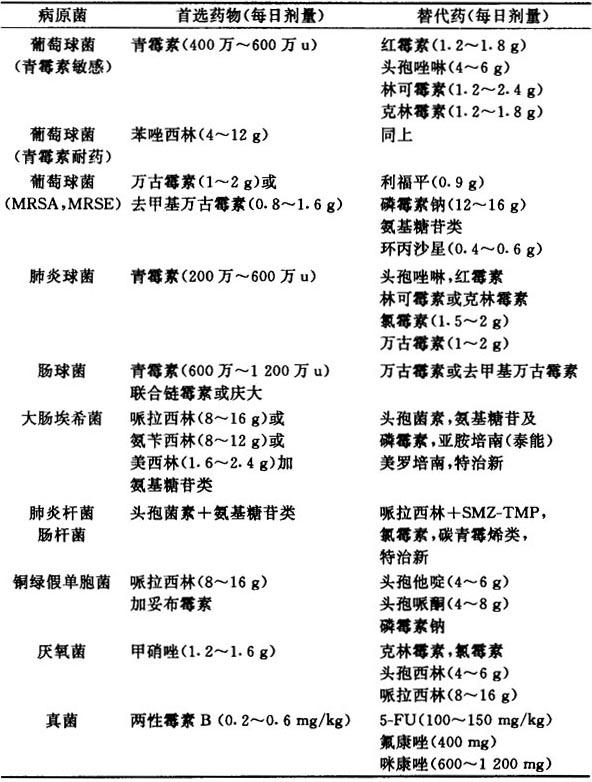 | 释义 | 败血症 【释义】: 败血症(septicemia)是指病原菌及其毒素侵入血流所致的临床综合征。可有高热、寒战、心动过速、呼吸急促、皮疹、神志改变等一系列临床症状。病原菌除金黄色葡萄球菌、肺炎球菌、链球菌仍较常见外,当前革兰阴性杆菌有取代这些球菌而成为败血症的主要原因的趋势,这类杆菌包括大肠埃希菌、肺炎杆菌、沙雷菌、沙门菌、铜绿假单胞菌、变形杆菌、类产碱杆菌、厌氧菌等,此外白念珠菌、曲菌、毛霉菌、新型隐球菌等引起败血症也有增多趋势。因院内感染而引起的败血症也不断有报道,如硝酸盐阴性杆菌、模拟杆菌、其他假单孢菌、欧文菌属等。个别报道,以往被认为只在肠道引起感染的痢疾杆菌有时也可侵入血流造成败血症。 【诊断】: 1.临床表现 (1)症状 ①起病急骤,凡有原因不明的畏寒、发热、头痛、休克、出汗、血白细胞总数明显增高,特别当近期伴皮肤黏膜创伤、灼伤的体征,或皮肤病如湿疹、疖肿时均应考虑有否败血症。②发现有局灶性感染或某系统如胆管感染、尿道感染、呼吸系感染,但尚不足以解释全身症状时,也应考虑到败血症。③凡有用大剂量抗生素、广谱抗生素、各种免疫抑制剂、激素,尤当疗程过长时的免疫功能低下,以及长期慢性疾患体质衰弱者出现高热、畏寒等感染症状者应考虑本病。 (2)体征 1)皮肤瘀点、瘀斑,分布于躯干、四肢、眼结膜、口腔黏膜等。为数不多的可见荨麻疹、猩红热样皮疹、脓皮疹等。化脓性迁徙病灶,并有心内膜炎栓塞症群者。 2)进行性贫血及发热者。 3)微血管炎所致瘀斑皮肤出血者。 4)肝脾肿大者。 5)关节肿胀有化脓性病灶者。 2.实验室检查 (1)血常规 外周血显白细胞增多(10~30)×109/L,中性粒细胞占优势,但病情特别严重或全身衰弱者,可不升高或低于正常;原先有脾功能亢进或骨髓抑制者也可不升高;某些革兰阴性菌败血症血白细胞也可不升高,甚至低下,但在分类中有明显核左移现象,有中毒性颗粒出现。 (2)按不同病情选择相应标本作细菌、真菌、厌氧菌培养、血培养、骨髓培养有助诊断,尤应在选择抗生素前获得阳性结果,以便按药敏选用有效抗生素。 (3)NBT试验及AKP积分细菌性败血症在治疗的患者可升高,可帮助区分细菌性感染或非细菌性感染,若两种试验值均不高,则不倾向于败血症。 (4)鲎溶解物试验 革兰阴性杆菌内毒素定量检查,如为阳性提示革兰阴性菌感染。 (5)DIC全套 应在疑有弥漫性血管内凝血者作下列检查血小板计数、凝血酶元时间纤维蛋白定量、三P试验。必要时作F.D.P,Fi试验以及有关凝血因子,优球蛋白溶解试验等。 3.鉴别诊断 在临床观察中需与变应性亚败血症、伤寒、粟粒性结核、恶性组织细胞病、红斑狼疮、淋巴瘤病毒感染等相鉴别。 【治疗】: 1.治疗原则 在临床观察时积极分离病原菌,选送各种可疑标本作细菌或真菌培养,在未找到致病菌前可按临床表现及感染途径,经验性选用抗菌药物,一旦分离到致病菌按抗菌素药敏选用有效抗菌药物,以达到根治目的。 2.一般治疗 (1)卧床休息,供应易消化并含足够热量、维生素及水分的食物,视病情给予流质、半流质、普食。 (2)维持水、电解质和酸碱平衡 适当补液加强支持治疗,必要时输血浆、丙球、白蛋白等。 (3)加强护理 注意口腔、皮肤卫生,处理局部病灶,防止褥疮发生。 3.抗病原体治疗 见表1-2。 表1-2 抗病原体治疗