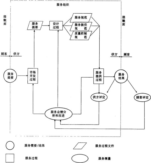 图14.3-1 质量体系的关键方面 2.管理者职责 服务组织管理者的职责有以下三个方面: (1)制定一个顾客和社会满意的质量方针和目标,并组织实施这个质量方针和达到质量目标。 (2)为了实施质量方针,应建立服务组织的质量体系。 (3)为了质量体系的保持和有效的运作,应不断地对质量体系进行评审。 3.人员和物质资源 正如质量体系定义所指出的那样,资源是五大组成部分之一。一个服务组织在建立本组织质量休系时必须提供一定的资源,所提供的资源应着眼于: (1)足够的资源。这是指为了完成服务组织全部服务工作和达到质量目标所必需人力和物力资源; (2)适当的资源。这是指资源应根据质量目标,相对于服务需要来提供的,不是一味的追求高档次、高标准,而是考虑到经济合理,不无谓地增加服务成本。 4.质量体系结构 服务组织应根据本组织的实际情况和内外环境来建立本组织的质量体系结构。质量体系结构一方面可以说由组织结构、程序和资源三个部分所组成,另一方面又可以理解为质量体系结构是由若干运作要素加以支撑的,这些运作要素将在下一节中阐述。 为了能够实现规定的质量方针和目标,服务组织应开发、建立、成文、实施和保持一个质量体系。这里值得注意的是,质量体系的运作应强调两个方面的作用: (1)控制和预防。以预防性的活动来控制服务的全过程,避免发生问题。 (2)反应和纠正。一旦发生失误时,具有作出反应和纠正失误的能力。 在这里,GB/T19004·2-ISO9004-2强调了服务质量环,把服务全过程分为服务市场开发,服务设计和服务提供等三个过程,以及业绩的分析与改进,如图14.3-2所示。