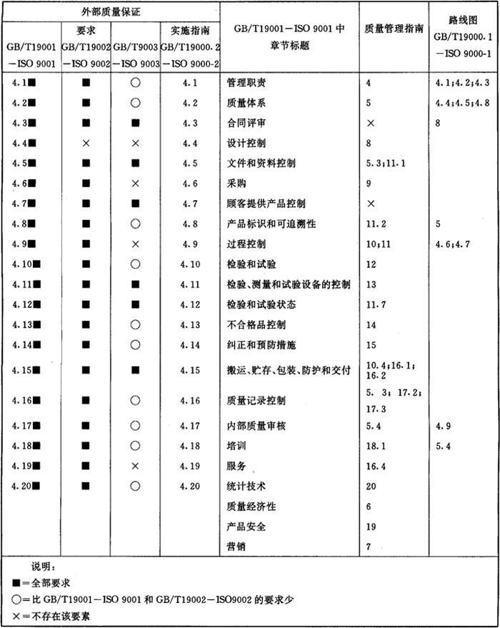 | 释义 | 质量保证模式 1.质量保证及质量保证模式的定义 GB/T6583-ISO8402-1994《质量管理和质量保证术语》给出了有关质量保证和质量保证模式的定义。 (1)质量保证 质量保证(qualityassurance)是指“为了提供足够的信任表明实体能够满足质量要求,而在质量体系中实施并根据需要进行证实的全部有计划和有系统的活动。” 该定义的“注”是: *质量保证有内部和外部两种目的。 a)内部质量保证:在组织内部,质量保证向管理者提供信任。 b)外部质量保证:在合同或其他情况下,质量保证向顾客或他方提供信任。 *质量控制和质量保证的某些活动是相互关联的。 *只有质量要求全面反映了用户的要求,质量保证才能提供足够的信任。 可以对以上定义和注释作如下几点解释: ①质量保证是一种有目的、有计划、有系统的活动,不是一些互不相关的活动,也不是一些质量活动的机械组合。 ②质量保证分为内部质量保证和外部质量保证两种目的。外部质量保证是建立在内部质量保证基础上的。 ③只有当质量要求全面和正确地反映了顾客的要求,质量保证才可能提供足够的信任。因此,质量要求是质量保证的前提和基础。 ④质量保证的某些活动是和质量控制相互关联的,有效的质量控制才能达到质量保证的目的。 ⑤质量保证是在质量体系中实施的活动。也就是说,质量保证依赖于质量体系的运行。 ⑥质量保证活动根据需要应进行证实,即重视验证工作,重视提供证据。 (2)质量保证模式 质量保证模式(modelqualityassurance)是指“为了满足给定情况下质量保证的需要,标准化的或经选择的一组质量体系的综合要求”。 可以对以上定义作如下几点解释: ①质量保证模式是质量体系的一组综合要求,其目的是为了满足给定情况下质量保证的需要。 ②质量保证模式可以是标准化的,如GB/T19001-ISO9001~GB/T19003-ISO9003就是三种不同的经标准化了的质量体系的综合要求。质量保证模式也可以是经过选择并确定的一组质量体系的综合要求。 ③质量保证模式在签定合同、第二方认定和第三方认证时使用。 2.三种质量保证模式 三种质量保证模式是指GB/T19001-ISO9001《质量体系设计、开发、生产、安装和服务的质量保证模式》、GB/T19002-ISO9002《生产、安装和服务的质量保证模式》和GB/T19003-ISO9003《最终检验和试验的质量保证模式》。其相应题目、章节和序号的对照表如表15.4-2所示。表中列出了三种质量保证模式不同的质量体系要求。 表15.4-2 相应题目章节序号对照表