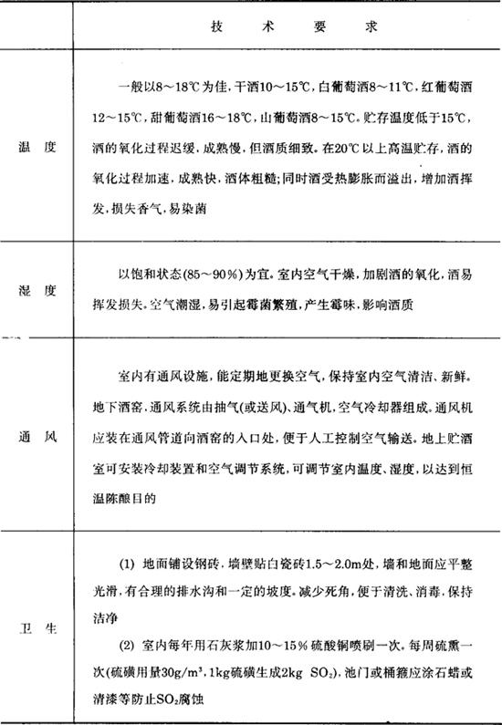 一、贮酒室 老式的葡萄酒厂贮存陈酿过程,是在传统的地下酒窑中进行。随着近代冷却技术的发展,广泛采用人工快速老熟新技术,有效地加快了葡萄酒的陈酿过程,缩短了葡萄酒的酒龄,提高了设备利用率和工厂的经济效益,所以近代葡萄酒陈酿已向半地下、地上和露天贮存方式发展,而逐步取代了那些造价昂贵、施工技术复杂的地下酒窑。 贮存方式的选择,应根据产品的工艺和质量的要求.结合当地气候、土壤、地下水位及材料来源等因素决定。北方应考虑防冻,南方应注意过高气温的影响,所以除东北以外,一般多采取地上贮存或露天大罐贮存方式。 当然,地下酒窑可以防止温度急剧变化,使酒有一个稳定的陈酿环境,酒质经过陈酿而更加细腻;获得雅致的风味,尤其对一些低度酒的贮存更为有利。而近代广泛采用的地上贮酒室陈酿,虽受季节气候变化的影响,温度变化大,影响陈酿效果。但如采取一定措施,运用冷却技术,来调节贮酒室的温度和湿度,同样可以达到如期的陈酿目的。 现代化贮酒室,应注意下列4个技术要求(见表3-7-1)。 表3-7-1 贮酒室技术要求