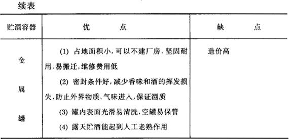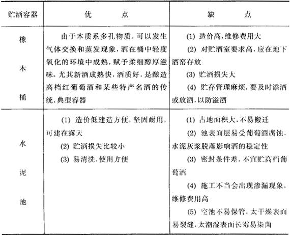二、贮酒容器 当今葡萄酒贮存容器主要有三大类,即是橡木桶、水泥池和金属罐(包括碳钢或不锈钢)。目前国内使用较广泛的是水泥池。随着技术进步,金属罐,特别是不锈钢罐和露天大型金属罐正在取代其他两种容器。 新酒在木桶中陈酿,成熟快,酒质好;而在水泥池、金属罐中成熟慢,酒质欠佳。但经过长期陈酿(2年以上)后,口味反而更好。 当然,橡木桶是陈酿葡萄酒的传统典型容器,是酿造某些特产名酒或高档红葡萄酒必不可少的特殊容器。而酿制优质白葡萄酒,用不锈钢罐最佳。国内近几年来一些酒厂已从国外引进或加工这种不锈钢贮酒罐。这是贮酒容器的发展方向。 关于上述三类贮酒容器的优缺点比较,见表3-7-2。 表3-7-2 贮酒容器的优缺点比较
