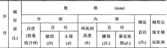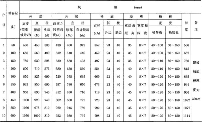 (一)木桶 1.木桶规格 (1)小型木桶 容量有50、100、150、200、300、350、400、450、550、和600L。其具体尺寸规格见表3-7-3。 表3-7-3 小型木桶规格表