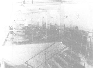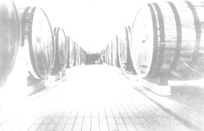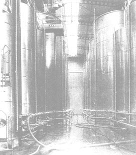 图3-7-1 橡木桶贮酒室 (二)水泥池 1.构造 水泥池一般有钢筋混凝土整体浇注和砖砌及块石砌成3种类型。以第一种类型为主,一般呈矩形、圆筒形。容量为10000~50000L,大型水泥池可达200000L。矩形水泥池有单层、双层和三层重叠建造而成。 水泥池容量计算公式: (1)矩形水泥池 V=a·b·h 式中 V——水泥池容量(m3) a——池内部长度(m) b——池内部宽度(m) h——池内部高度(m) (2)圆形水泥池