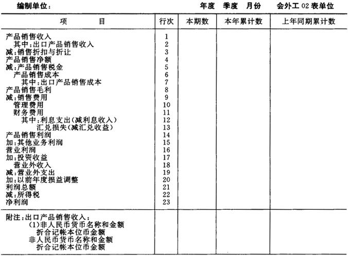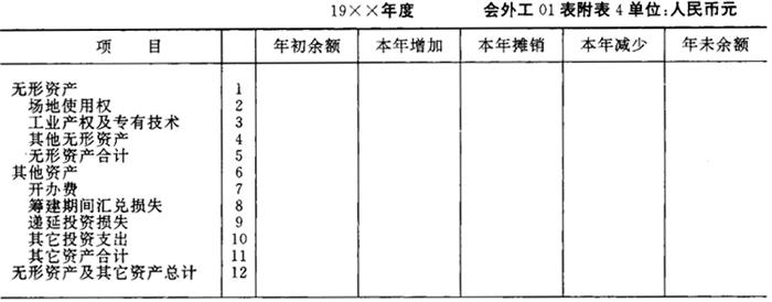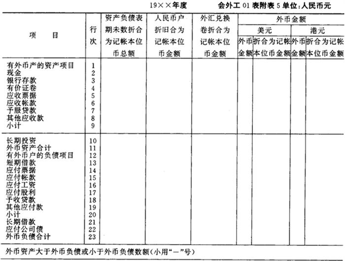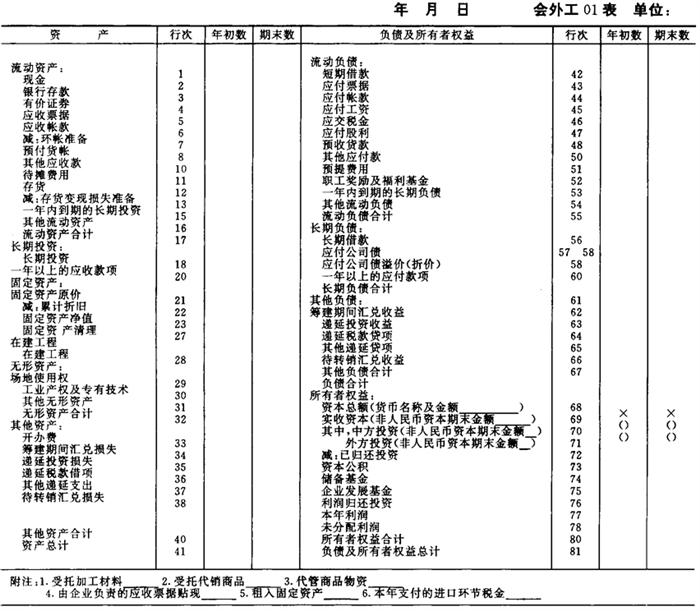 本表与编方法及要求如下: ①本表与为“年初余额”、“本年增加”、“本年摊销”、“本年减少”和“年末余额”五栏,根据无形资产和其他资产各帐号的记录分析填列。 ②“年初余额”和“年末余额”两栏,应分别填列各项目的年初,年末摊余净额,前应与“资产负债表”的有关数字一致。 ③本表“年初余额”+“本年增加”-“本年摊销”-“本年减少”=“年末余额”。 ④本表“本年摊销”栏无形资产合计“项目的数额”,应与“管理费用明细表”中“无形资产摊销”项目“本年实际”栏的数额的相等。 (5)外币资金情况表。外币资金情况表是反映企业报告期末外币资产与外币负债情况的报表。抻用该表可集中反映企业外币资金的组成情况,了解企业外币资金的平衡情况。 ①本表所称“外币”,是指非人民币的货币。对可以非人民币货币作业记帐本位币的企业,其人民币也不包括右去表“外币”概念中。 ②本表“外币户金额”(期末数)栏,按不同的外币与为“外币金额”与“与折合为本位币金额”两栏,企业如有多种外币的银行或往来款项,可以增设栏次反映。本栏各项月应分别根据右关帐户所属外币帐户的期未余额填列。 本表中“资产负债表期末折合为记帐本位币总额”栏的数字应与各种货币“折合为记帐本位币金额”的数字之和相等。 ③“外币资产大于或小于外币负债的数额”,为各项外币资产合计数减去各项外币负债合计数的差额,以及各项外币资产折合为记帐一位的合计数减去各项外币负债折合为记帐本位币的合计数的差额。外币资产小于外币负债的差额,应以“-”号表示。 ④本表中某些项目如果只在人民币数字而没有币数字的,可以不填。如果在其他外币户的资产、负债项目的,还应补充填列。 |