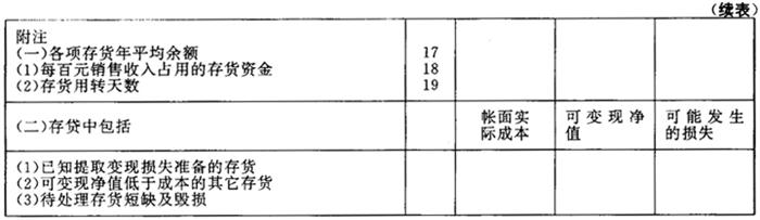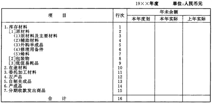 二、资产负债表及其附表的编制方法 1.资产负债表的编制方法 (1)资产负债表中各项目年初数,可根据上年度资产负债表中各对应项目年末数填列。如果本年度资产负债表各项目的名称和内容同上年不一致,应将上年度资产负债表各项目的名称和年末数作相应的调整,然后填入本年度资产负债表的年初数栏内,并加以说明。 (2)资产负债表中各项目的期末数,根据有关帐户的期末余额直接填列或合并填列。具体分述如下: ①企业所有外币的银行存款,银行借款和外币的应收收,应付款项的期未余额合并反映。同时这些有外币的项目还应在附表《外币资金情况表》中另行反映。 ②有应收票据贴现业务的企业,“应收票据”项目应根据“应收票据贴现”帐户的余额减去①“应收票据贴现”帐户余额后的差额列,以反映期末企业实际持有的应收票据净额,同时,应在表下附注中填列“由企业负责的应收票据贴现”。票据上的应计利息收入应在“其他应收款”项目中反映。 ③“应收帐款”项目,反映企业因销售产品和提供劳务应向购买单位收取而期末尚未收回的帐款余额,应根据“应收帐款”帐户的期末余额填列。 ④“予付货款”项目,反映企业根据购货合同予付供应单位购货定金和部份货款,应根据“予付货款”帐户的期末余额填列。 ⑤“存货”项目,反映企业期末结存在库的,在途的和加工中的各项存货的实际成本。应根据“材料采购”,“原材料”、“包装物”、“低值易耗品”、“材料成本差异”、“委托加工材料”、“自制半成品”、“产成品”、“生产成本”、“外购商品”、“委托代销商品”等帐户的期末余额合计数填列。 企业尚未处理的各项存款的短缺,毁损,应将其“帐面实际成本”、“可变现净值”和“可能发生的损失”在本表附表“存货表”下端加以反映。 ⑥企业如有因毁损,废弃等原因转入清理但尚未清理完毕的固定资产,其原价和累计折旧以及固定资产清理过程中所发生的清理费用。和变价收入等各项金额的差异,应在“固定资产净值”项目下,增列“固定资产清理”项目予以反映。 ⑦企业如有按融资租赁方式租入的固定资产,应在固定资产类后,填列“融资租入固定资产原价”、“减融资租入固定资产累计折旧”和“融资租入固定资产净值”三个项目,并在本表负债方,长期负债项下增列“融资租入固定资产应付款”项目,予以反映。融资租入固定资产应付款中一年到期应付的部分,应在流动负债类后增列“一年内到期的融资租入固定资产应付款”项目,单独反映。 ⑧“在建工程”项目,反映企业期末各项未完工程的实际支出。包括交付安装的设备价值,未完建设工程已经消耗的材料,工资和费用支出,工程用料结存,工程价款,已经建筑安装完毕但尚未交付生产使用的建筑工程的成本等。本项目的数额应与本表附表《在建工程表》右方各项目的合计数相等。 ⑨“无形资产及其它资产”各项目,按企业期末无形资产和其他资产摊销后的余额填列。企业有租入固定资产改良及大修理支出的,其尚未摊销的期末余额,应在本表“开办法”项目增列“租入固定资产改良及大修理支出项目单独反映。”本项目的本年增加数,本年摊销数和年初,年末的摊余净额,应在本表附表《无形资产及其他资产》内填列。 ⑩“应付帐款”项目,反映企业因购买原材料,接受劳务等在期末尚未向提供单位清偿的帐款,应根据“应付帐款”帐户的期末余额分析填列。“应付帐款”帐户所属明细帐户期末借方余额中属于在途材料的部份,应包括在本表“存货”项目之内。并在本表表“存货表”中“在途材料”项目反映。 ⑾“予提费用”项目,反映企业所有已经预提计入成本、费用各项支出。“制造成本”帐户在年度中间如贷方余额,可合并在本项目内反映。 ⑿“长期借款”项目,反映企业向银行和其他单位借入的长期借款。长期借款中应于一年之内到期归还部份,如不准备用别项长期借款来抵补,应从本项目扣除,另在本表流动负债各项目之后,增列“一年到期的长期借款”项目另行反映。 ⒀“实收资本”项目,反映投资人实际投入资本总额,根据“实收资本”帐户的期末余额填列。为了与注册资本经比较,企业应在“实收资本”项目上的“资本总额”项目的括号内,填列企业按合同,协议,章程规定的资本总额。企业的资本总额按外币计算的,应在“资本总额”项目括号内填列外币名称和金额,并在“实收资本”项目及下面的“中方投资”、“外方投资”项目的括号内分别列入实际投入时的汇率折合的外币资本金额的具体数字。 ⒁“本年利润”项目,反映自年初至本年末止的的累计利润(亏损)总额。应根据利润表中利润总额项目的“本年累计数”栏数字填列。如为亏损以“一”号表示。在年度资产负债表中,因本年的利润(亏损)总额已自“本年利润”帐户转入“末分配利润”帐户,本项目应空置不填。 2.资产负债表附表的编制 (1)存货表。存货表是反映企业年末各项存贷结存情况的报表。它是资产负债表的附表,是对年度资产负债表中的“存货”项目作进一步详细说明的报名。 ①本表共分三栏。“本年计划”。栏,根据企业年度财务成本计划数字填列。“本年实际”栏,根据存贷各帐户和“材料成本差异”帐户及所属明细帐户的年末余额分析计算填列