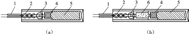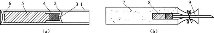 图1-69 火雷管示意图 (a)火雷管;(b)火花起爆药包的组成 1-雷管壳;2-加强帽;3-传火孔;4-正起爆炸药;5-副起爆炸药;6-窝槽(聚能穴);7-炸药包;8-火雷管;9-导火线