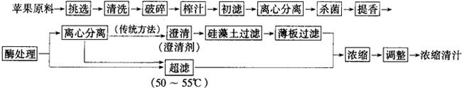 | 释义 | 超滤在果蔬汁澄清中的应用 超滤在果蔬汁加工中主要用于澄清,这项研究始于20世纪70年代初期,目前已成功用于苹果汁、梨汁、菠萝汁、柑橘汁、葡萄汁、猕猴桃汁、樱桃汁、草莓汁等果汁和番茄、芹菜、冬瓜等蔬菜汁的澄清。 超滤在果汁加工中应用最为广泛的是苹果汁的澄清。采用果胶酶等酶制剂澄清苹果汁,过滤后往往还含有少许胶体物质、蛋白质和单宁,经过加热杀菌或在贮存过程中,常会出现浑浊或沉淀,影响果蔬汁的品质。而且酶法脱胶时间长,需在45~50℃温度下反应,是一种不连续的批量生产方式。而且酶脱胶后还要进行离心分离和硅藻土、薄板过滤等操作。在澄清化过程中往往会引起果蔬汁的变质、褐变和香气散失等现象。 在水果榨汁后,用超滤可以一举取代酶化脱胶、澄清和过滤的工序,大大简化了苹果汁的澄清过程。用超滤取代传统澄清方法的工艺流程参见图2-1-9,利用膜技术澄清果汁的理想目标是用超滤取代果汁澄清中的脱胶工序,一方面使果蔬汁得到澄清,同时被截留的果胶可以进一步提纯利用。可是鉴于现有的技术水平,超滤在果汁加工方面的应用还有一定的限制。为了提高膜的效率,同时提高汁的透过率,增加汁的稳定性,目前普遍采用的生产工艺是用酶法脱胶和超滤澄清相结合的方法。一般在超滤装置前配备一个容积约20m3的循环罐,循环罐同时又是待滤汁的贮罐。苹果初滤榨汁在酶反应罐内于50℃左右温度下反应2~3h,脱胶果汁泵入循环罐内进行超滤,透过膜的清汁送入缓冲罐,并送往蒸发工序进行浓缩,被截留的浑汁由循环泵送回循环罐内,并重新进行超滤,如此循环,罐内汁中的浑浊物的含量不断增加。另一方面,在超滤的同时,不断向循环罐内添加待超滤的新鲜果汁,其添加速度与超滤速率大致相同。在此情况下,从宏观看酶法脱胶与超滤澄清成为一个连续过程,整个操作过程可持续20~24h。当循环罐中的浑浊物达到限定值,即将停止超滤操作以前,向循环罐内加入果汁蒸发时的二次蒸汽的冷凝水,将浑浊物浓度高的果汁稀释,再行超滤,最后再停止超滤操作,这种方法称稀释超滤法。停止操作后将罐内的残液和沉淀的固体渣滓排出罐外,重新开始下一循环的超滤工作。