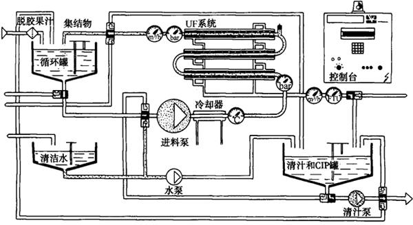 图2-1-9 超滤法生产苹果浓缩汁的生产工艺流程 超滤系统见图2-1-10,可用于果蔬汁澄清的超滤膜有管式膜、平面膜和空心纤维膜三种类型,常用管式膜组件,截留相对分子质量1~30万。超滤膜材料目前仍以有机膜,例如聚砜为主,但也有用陶瓷和碳材料等制造的无机膜。与有机膜相比,无机膜更耐清洗,并可进行反清洗。陶瓷膜用二氧化锆(ZrO2)或氧化铝(Al2O3)等材料制造,机械强度较高,且耐酸碱,在-180~+300℃温度范围内均很稳定。