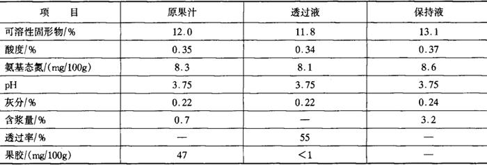 图2-1-10 果汁超滤系统图 表2-1-46为使用截留相对分子质量3万的超滤膜时,苹果汁超滤液的分析结果。由表可见,超滤可以在保持其他有用成分的情况下,去除果胶和悬浮固形物微粒,果汁透明度可达0.3NTV。 表2-1-46 苹果汁超滤液的性质