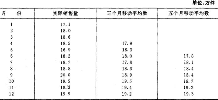 式中, 在使用公式(3.1)计算预测值时,计算期数N一经确定,就不能再变,只能是用以计算平均数的数值的交替更换。 图表3-3列出了某种商品1993年各月份的实际销售量(观测值)和按三个月与五个月计算的简单移动平均预测值。在该表里,1993年四月份的预测值17.9,就是根据1,2,3期的销售量计算得出的,即17.9= 图表3-3