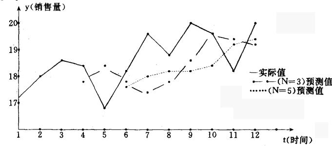 在图表3-4中,我们绘制了实际销售量和两种移动平均预测值的变动线。我们看到,计算期不同,得到的预测值也不同,两种预测值的变动曲线,以按五个时期计算者较平稳,按三个时期计算的预测值变动度幅度大些。就预测来说,选择怎样的计算期数N更为合适,这需通过计算绝对平均误差(MAE= 图表3-4