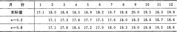 =αYt+(1-α)〔αYt-1+(1-α) =αYt+α(1-α)Yt-1+(1-α)2Yt-1 最后有,Yt+1=αYt+α(10α)Yt-1+α(1-α)2Yt-2+… 从这个等式可以看到,权数〔α,α(1-α),α(1-α)2等〕是依次递减的,并且随着t值的增大,权数α(1-α)t将消失为0。这说明,指数移动平均公式体现了过去时期数据影响的递减性。 现用指数移动平均法对图表3-3的观测数据计算,得出图表3-5。 图表3-5
