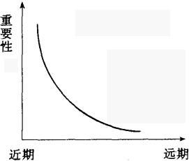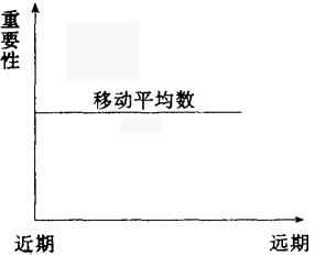 这里,最初的预测值 仿照图表3-3的作法,很容易作出与图表3-2对应的图形,请读者来作。 二、指数平滑法 趋势预测法虽然比平均法考虑了趋势的变化,但是,它在利用前期的平均数和趋势平均数时,把各期的变化平均化了。实际上,近期的数列与远期的数列(或资料)对预测未来的影响是不同的。指数平滑法的基本原理是对过去不同的时期的历史数列予以不同的权数加权。则指数平滑法应用的是加权移动平均数,期愈近加权愈大,近期值越重要;期愈远,加权愈小、重要性亦越小。而趋势预测法应用移动平均数,无论期数远近,移动平均数同样重要。示意如图表3-6和3-7所示。 图表3-6