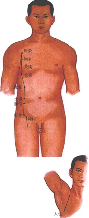 冲门Chōngmén(SP 12) 【定位】 在腹股沟外侧,距耻骨联合上缘中点3.5寸,当髂外动脉搏动处的外侧。 【主治】 腹痛,疝气,崩漏,带下。 【操作】 避开动脉,直刺0.5~1寸。 府舍Fǔshè(SP 13) 【定位】 在下腹部,当脐中下4寸,冲门上0.7寸,距前正中线4寸。 【主治】 腹痛,积聚,疝气。 【操作】 直刺1~1.5寸。 腹结Fǔjié(SP 14) 【定位】 在下腹部,大横下1.3寸,距前正中线4寸。 【主治】 腹痛,腹泻,便秘,疝气。 【操作】 直刺1~1.5寸。 大横Dàhéng(SP 15) 【定位】 在腹中部,距脐中4寸。 【主治】 腹痛,腹泻,便秘。 【操作】 直刺1~1.5寸。 腹哀Fǔāi(SP 16) 【定位】 在上腹部,当脐中上3寸,距前正中线4寸。 【主治】 消化不良,腹痛,便秘,痢疾。 【操作】 直刺1~1.5寸。 食窦Shídòu(SP 17) 【定位】 在胸外侧部,当第5肋间隙,距前正中线6寸。 【主治】 胸胁胀痛,翻胃,腹胀,食入即吐,水肿。 【操作】 斜刺或向外平刺0.5~0.8寸。 天溪Tiānxī(SP 18) 【定位】 在胸外侧部,当第4肋间隙,距前正中线6寸。 【主治】 胸胁疼痛,咳嗽,乳痈,乳汁少。 【操作】 斜刺或向外平刺0.5~0.8寸。 胸乡Xiōngxiāng(SP 19) 【定位】 在胸外侧部,当第3肋间隙,距前正中线6寸。 【主治】 胸胁胀痛。 【操作】 斜刺或向外平刺0.5~0.8寸。 周荣Zhōuróng(SP 20) 【定位】 在胸外侧部,当第2肋间隙,距前正中线6寸。 【主治】 咳嗽,气逆,不思饮食,胸胁胀满。 【操作】 斜刺或向外平刺0.5~0.8寸。 大包Dàbāo(SP 21) 【定位】 在侧胸部,腋中线上,当第6肋间隙处。 【主治】 气喘,胸胁胀痛,全身疼痛,急性扭伤,四肢无力。 【操作】 斜刺或向后平刺0.5~0.8寸。 |