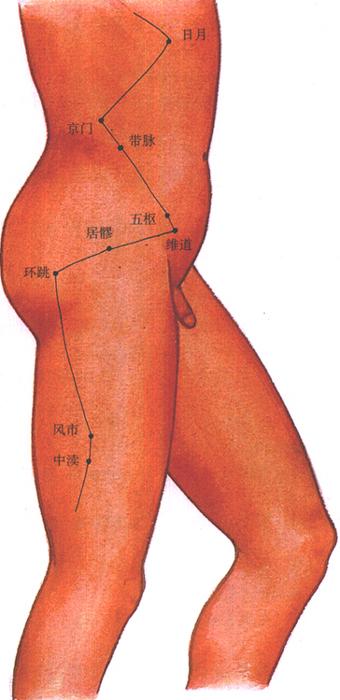 日月Rìyuè(GB 24) 【定位】 在上腹部,当乳头直下,第7肋间隙,前正中线旁开4寸。 【主治】 黄疸,呕吐,吞酸,呃逆,胁痛。 【操作】 斜刺或平刺0.5~0.8寸,不可深刺,以免伤及脏器。 京门Jīngmén(GB 25) 【定位】 在侧腰部,章门后1.8寸,当第12肋骨游离端的下方。 【主治】 小便不利,水肿,腹胀,腹泻,呕吐,腰痛,胁痛。 【操作】 直刺0.5~1寸。 带脉Dàimài(GB 26) 【定位】 在侧腹部,章门下1.8寸,当第11肋骨游离端下方垂线与脐水平线的交点上。 【主治】 少腹痛,月经不调,阴挺,经闭,赤白带下,疝气,腰胁痛。 【操作】 直刺0.8~1寸。 五枢Wǔshū(GB 27) 【定位】 在侧腹部,当髂前上棘前方,横平脐下3寸处。 【主治】 阴挺,赤白带下,月经不调,疝气,腹痛,便秘。 【操作】 直刺1~1.5寸。 维道Wéidào(GB 28) 【定位】 在侧腹部,当髂前上棘的前下方,五枢前下方0.5寸。 【主治】 阴挺,赤白带下,月经不调,疝气,少腹痛,便秘,肠痈。 【操作】 直刺或向前下方斜刺1~1.5寸。 居髎Jūliáo(GB 29) 【定位】 在髋部,当髂前上棘与股骨大转子最凸点连线的中点处。 【主治】 腰痛,下肢痿痹,疝气,少腹痛。 【操作】 直刺1~1.5寸。可灸。 环跳Huántiào(GB 30) 【定位】 在股外侧部,侧卧屈股,当股骨大转子最凸点与骶管裂孔连线的外1/3与内2/3交点处。 【主治】 腰腿疼痛,下肢痿痹,半身不遂。 【操作】 直刺2~3寸。 风市Fēngshì(GB 31) 【定位】 在大腿外侧部的中线上,当腘横纹上7寸。或直立垂手时,中指尖处。 【主治】 下肢痿痹、麻木,半身不遂,遍身瘙痒。 【操作】 直刺1~1.5寸。 中渎Zhōngdú(GB 32) 【定位】 在大腿外侧,当风市下2寸,或腘横纹上5寸,股外侧肌与股二头肌之间。 【主治】 下肢痿痹、麻木,半身不遂。 【操作】 直刺1~1.5寸。 |