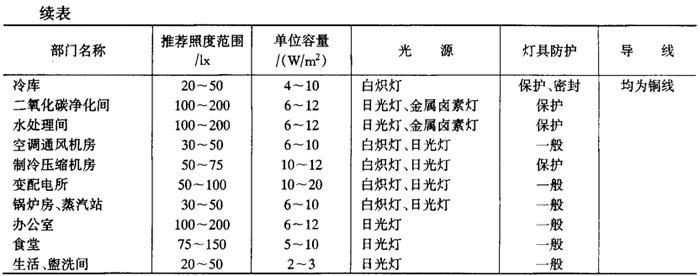 3.冷冻机房配电 用氨作制冷剂时,冷冻机房属于Q3级爆炸危险场所,除考虑事故排风装置外,配电设备应尽量采用密闭式,导线选用铝芯线。 4.冷藏库配电 冷藏库属潮湿环境,配电装置应考虑防水型。冷藏库外部干线、支干线可考虑用铝芯线,冷藏库内均用铜芯线。冷藏库内冷风机应有运用指示和断相保护。 (二)车间照明 1.车间照明一般原则 (1)照明电源在车间内部必须与动力分开,应留有备用回路。主要生产车间宜装设值班照明和疏散照明。 (2)生产照明普遍使用日光灯,车间层高超过6m时可采用金属卤素灯。路灯一般采用中显色钠灯或金属卤素灯。 (3)饮料车间使用的日光灯应有防湿措施、开关最好分批集中控制,有利于车间整洁卫生。路灯集中传达室控制。 (4)糖浆车间、水处理间、餐厅、厨房、糖库、包装区等需装设灭蝇灯。 2.照明技术参考指标 照明技术参考指标见表6-7-21。 表6-7-21 照明技术参考指标
