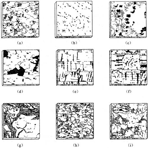 图24-3 软木的结构 软木地板是以优质的天然软木(即栓皮栎树的树皮)为原料,经过粉碎、热压而制成的板材,再通过机械设备加工成地板。还可以以软木为基层,优质原木薄板为表层,经加工复合成软木复合地板。这种板材外形类似于软质厚木板,因此,人们误称为“软木”。 如果将软木颗粒用现代工艺技术压制成规格片状,表面有透明的树脂耐磨层,下面有PVC防潮层,这是一种优良的天然复合地板。这种地板既保持了原木天然的色泽纹理,又具有软木特有的弹性和柔韧性,看似木板,踏如地毯。再加上由于软木具有特殊的细胞结构,使得这种复合软木地板具有自然美观、弹性良好、脚感舒适、吸声减震、保温隔热、防水防火、抗静电、耐污染、耐磨损、不变形、不扭曲、不开裂等优点,被誉为“环保型高档装饰材料”,可以代替地毯,是一种理想的室内地板。 世界上的软木制品以葡萄牙的产品最为有名,其产量和质量均居世界首位。中国生产软木地板的厂家很少,但近几年在产品花色品种的开发和质量上都取得了较大的进步。现有的软木地板品种有天然软木地板、天然软木复合地板、特种橡胶软木地板等。地板的长条板规格尺寸有300mm×100mm、600mm×200mm、900mm×100mm、900mm×150mm、900mm×200mm、900mm×300mm、1200mm×100mm和1200mm×200mm等;方形板规格尺寸有300mm×300mm和400mm×400mm等。 我国生产的软木地板有长条形和方形两种,不仅能相互拼花,也可切割出任何几何图案。常见图案如图24-4所示。