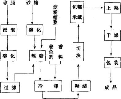 | 释义 | 软糖加工装备 1 概述 软糖是一种质地柔软、粘糯、多水分、微有弹性,外观呈透明、半透明状的糖果。用亲水性胶体与砂糖、淀粉糖浆、软化糖浆、香料等制成,花式品种多。根据其所含胶体性质可以分为琼脂软糖、淀粉软糖、明胶软糖等。软糖加工装备即是将上述原料按一定工艺要求经配料、溶化、过滤、熬制、成型、干燥、包装等工序制成软糖的机械和设备。 2 加工工艺 软糖的生产工艺主要包括:配料、溶化、过滤、熬制、成型、干燥、包装等。现以琼脂软糖为例加以说明,其工艺流程如图1-11-9所示。