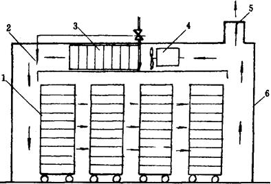 图1-11-9 琼脂软糖加工工艺流程 琼脂软糖的生产工艺过程:浸泡琼脂、熬糖、成型干燥、包装等。熬糖有常压熬制和真空熬制。当过滤后的琼脂溶液倒入溶化后的砂糖液和淀粉糖浆中进行熬煮,温度升至105~106℃。然后冷却此糖浆至76℃以下,加入着色剂和香料混合均匀。切块成型的糖液浓度为75%,浇注成型的糖液浓度为78%~79%。如采用切割成型,则将糖浆倒在盘内,放置过夜,任其凝结。然后切成糖块,外裹糯米纸,置于金属网架上,干燥、包装。 3 关键设备 软糖生产主要设备有:熬糖、成型、干燥、拌砂、包装等设备。熬糖、成形设备参见第1篇第11章第1节及第2节。 3.1 干燥设备 干燥设备在软糖生产中是不可缺少的设备。其型式有柜式烘箱烘房及隧道式烘房。国内一般小型生产厂家用的是柜式烘箱,而大、中型生产厂家则用大型烘房或隧道式烘房。 图1-11-10所示为软糖干燥烘房的一种形式。这种设备生产为间歇式的,利用蒸汽来加热干燥,烘房四周用隔热性能好的材料建成。蒸汽通过散热器加热空气,热空气循环和新鲜空气的补充,由顶部风机抽送。热空气沿着进风板吹入烘房,使热风上下分布均匀,并能减缓风压,避免粉尘飞扬,湿气从排出口排除,这样不断循环,使软糖得到干燥。干燥温度控制在45~50℃。干燥后成品含水率约为15%。