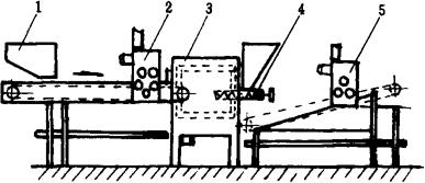 图1-11-11 软糖连续拌砂装置 1-软糖承受斗 2-蒸汽喷雾箱 3-拌砂机 4-砂糖加料器 5-二次蒸汽喷雾箱 |