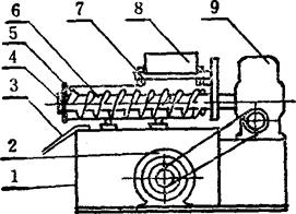 图5-7 螺杆式软颗粒饲料机结构示意图 1.机身;2.电动机;3.出料板;4.切刀;5.模板;6.螺杆;7.压辊;8.进料斗;9.减速箱 制粒机是该机的主要部分,是采用平模动辊式,即将平模固定在机体上,辊轮作公转,并在摩擦力的作用下自转。该机采用二级传动。第一级为三角皮带传动,这种传动方式有二个优点:一是噪音小,二是超载时,三角皮带传动会自行打滑,从而防止其它机件损坏。第二级传动选用SHO30汽车圆锥螺旋伞齿轮付,特点是传动比大,承载性能好,结构紧凑,比较经济。为了便于调节、拆装,主动齿轮轴、推力轴承等零件均组装在轴承套内。 制粒工艺是先将粉状饲料按需要的配比量加入搅拌筒,通过筒内两条反旋向带状叶片所产生的相反推力,使粉料不断地上下翻动,达到成份均匀的程度,与此同时,加水装置定量向搅拌筒内喷洒水份,接着开启插板,拌和料放入储料桶,由桶底的刮料板推动,送入提升机,经固定封闭管内螺旋片的螺转作用,垂直提升到制粒机。当混和的润湿粉状饲料进入制粒腔后,由刮板均匀地分配于平模表面,并在辊轮的压力作用下,通过模孔被挤压成密实的长条饲料,由位于平模下面的切粒刀割成颗粒,下落到旋转着的甩粒盘上,在离心力的作用下便得到所需要的软颗粒饲料。 (2)主要技术参数 (SRG-Z240型) 见表5-4。 表5-4 SRG-Z240型的主要技术参数表