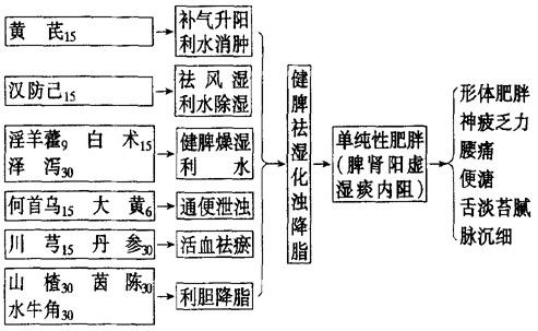 【要点】 本方由防己黄芪汤化裁而成。古人曰:肥人多湿;又曰:肥人多气虚。肥满每由气虚不能变化津液,津液蓄积化为痰浊所致。痰浊蓄于脉外则腠理充斥,积于脉中则血脉涩滞。防己黄芪汤,化气行水,恰中病机。本方又合用理血化滞之品,使湿祛脉通,不惟治标,兼能顾本。 【应用】 1.单纯性肥胖症。 2.高脂血症。 【注意】 1.肥胖不属痰湿壅盛者不宜。 2.孕妇禁用。 【类方】 1.茵陈降脂方(《上海中医药杂志》):由茵陈、生山楂、生麦芽组成。功能清热化湿,醒脾祛浊。用于高脂血症。 2.疲劳统治方(笔者经验方):由五味子、乌梅、山茱萸、木瓜、金樱子、枸杞子、山药、仙鹤草组成。功能养血柔肝。主治亚健康状态,身心疲劳。 |
