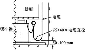 | 释义 | 轿底环境 维保程序如下: (1)清洁轿底卫生。 (2)检查所有的设备是否安装牢固,检查所有的螺栓是否紧固。 (3)检查轿底和轿底设备是否有锈蚀,如果有,则需要用400#~1000#砂纸打磨除锈,然后补防锈漆。 (4)检查轿底隔震橡胶的压缩量和橡胶是否老化变质。 (5)检查随行电缆的固定点是否牢固可靠。 (6)检查补偿链或补偿绳固定是否牢固可靠,保护是否齐全。 (7)检查随行电缆的运行弧度是否合适,能否挂碰井道设备。参考图25.7-1,随行电缆距离底坑地面必须有50~100mm距离,绝对不能拖底。随行电缆的弧度必须大于电缆直径的40倍,否则电缆将会因为弯曲过小而折断缆芯。检查随行电缆固定点,应该是电缆钢芯固定可靠,电缆绝缘皮不应该有破损。