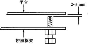 图25.7-2 轿底定位螺栓 (10)拉紧螺栓(防跳螺栓):安装拉紧螺栓是为了防止微动开关起用时,活动二层轿底从原来的位置跳开。主要是负载站立位置不均匀时,该螺栓可以起到补偿的作用。 拉紧螺栓应如图25.7-3所示安装,空载时,垫圈与轿厢框架间的间距应为1~2mm,垫圈的直径应大于轿厢框架的洞口。每台轿厢上有四个拉紧螺栓。
