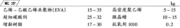 制法 (1)反应器中先加入抗氧剂1010、增黏树脂、高密度聚乙烯,在不断搅拌下升温至150~160℃全熔后,再加入EVA树脂及超细碳酸钙、微晶蜡,搅匀,在150~160℃下不断搅拌,保温2h,使混合物全部熔融成胶液体系。在整个熔融过程中,反应器应通入氮气保护。 (2)当混合体系变为均匀黏稠熔融体以后,即制成EVA型成型地毯热熔胶。这时可以趁热出料,出料温度过低就难以出料,出料后可让热熔胶在室温下冷却包装。 使用时将配制好的热熔胶投入挤出机,加热至一定温度使其从扁平机头流下,挤塑成熔融状薄膜,在两个辊筒间将熔融状薄膜压向织物纤网背面,冷却硬化定型。 |